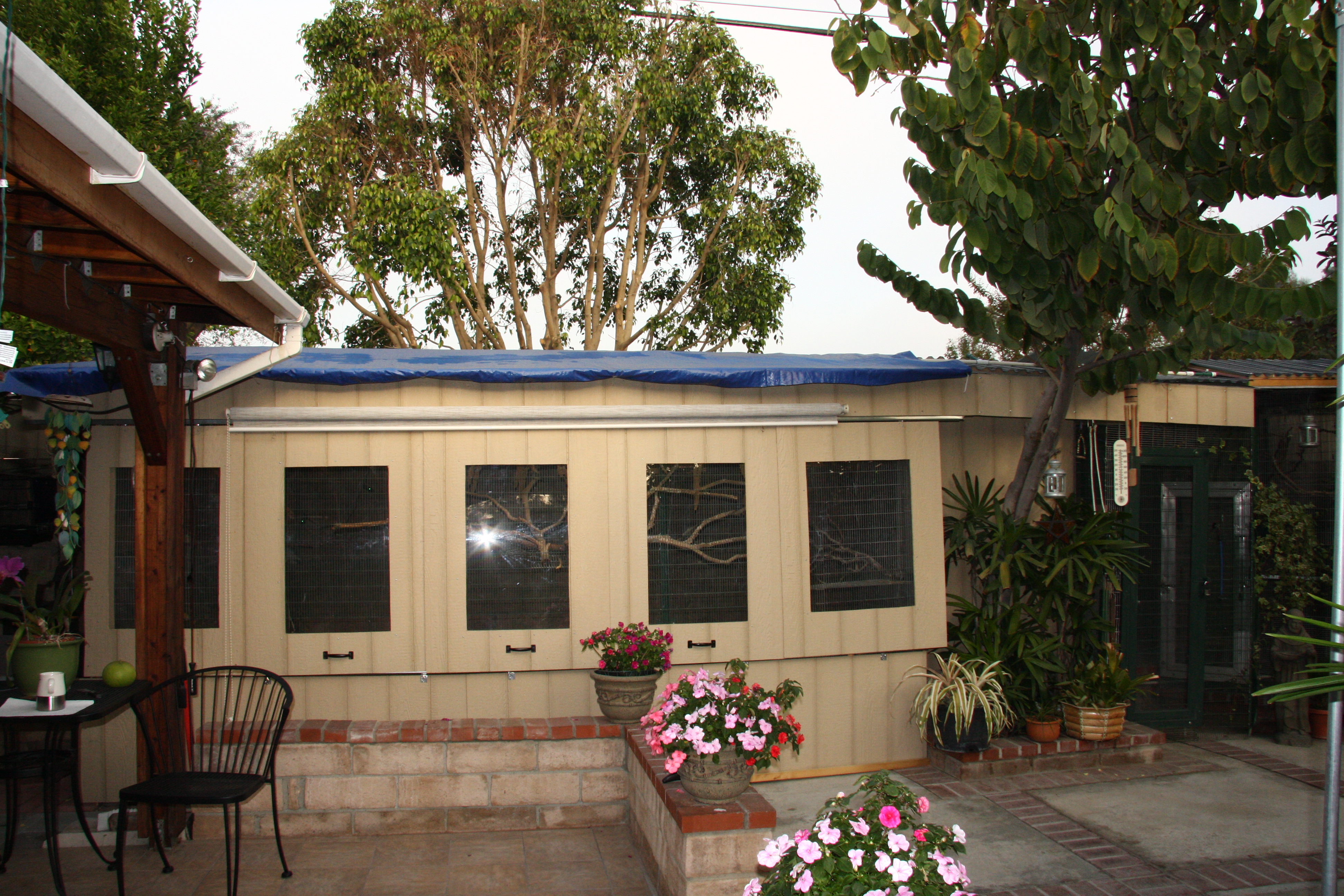 My original setyup was at the middle of the backyard to show off my birds. It wasn’t bad but I noticed that they are not producing as much I thought they would. All sides are open where fresh air passes thru the cage until an elderly breeder gave me a tip that I should have at least one or two sides of the aviary is protected from an element “wind, rain, cats, squirrel, etc. So I took his advice and now my new aviary location is built with the backside of our concrete wall fence and also had to face the morning sunrise which the birds will gather every morning. I built the front 5 window panels and cut out for flexi-glass for the sun to get through in the morning. All the window panels is designed to slide in and out for easy removal and back again when we have heavy rain and cold winter nights. It only takes less than 5 minutes to remove all the panels and put it back in.